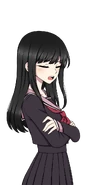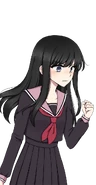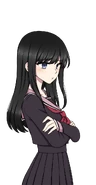 Juli appears graceful with her long black hair. She, along with her friends, is dressed in a school uniform comprising a black shirt, skirt, footwear, and a red bow tie.